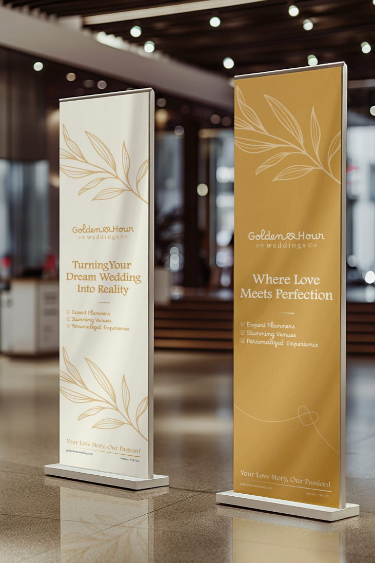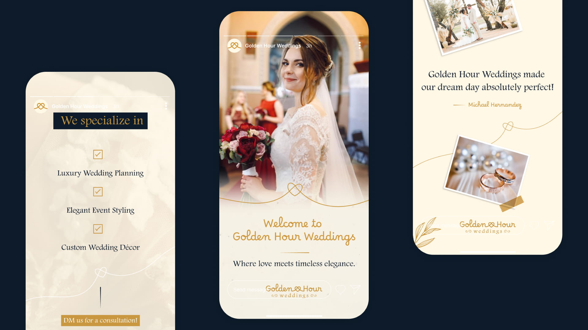 The resulting identity transforms Golden Hour Weddings from a service provider into a luxury brand. The new visual system provides a cohesive and premium experience across every client touchpoint. It successfully communicates the studio's unique ability to capture light and emotion, helping them attract modern couples who value artistic storytelling and a high-end aesthetic.